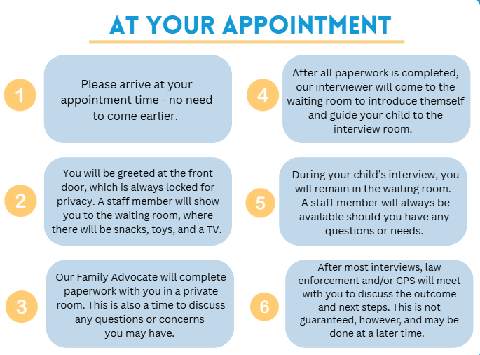 A: We welcome a family member or friend to come along for support. We do not allow any alleged offenders inside of the center to ensure a safe and friendly environment for you and your child.